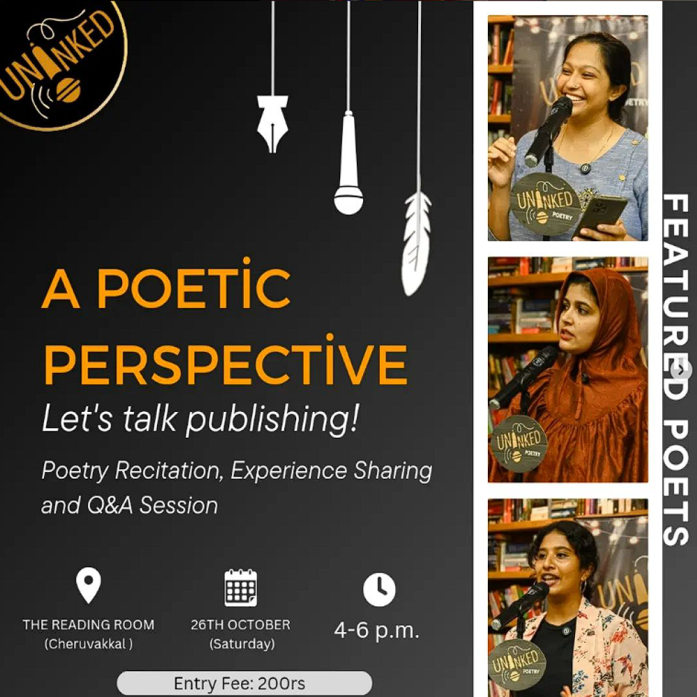 Join us for an intimate and inspiring evening of all things poetry. From that first flood of emotions to finding the right channels to share your work. (Books, Videos and Stage) The session will include recitation of works by Uninked's very own- Niranjana, Arwa and Sneha. Followed by insights from their journey and a Q&A session. Date: 26th October (Saturday) Time: 4-6pm Venue: The Reading Room (Cheruvakkal) Entry Fee: 200rs