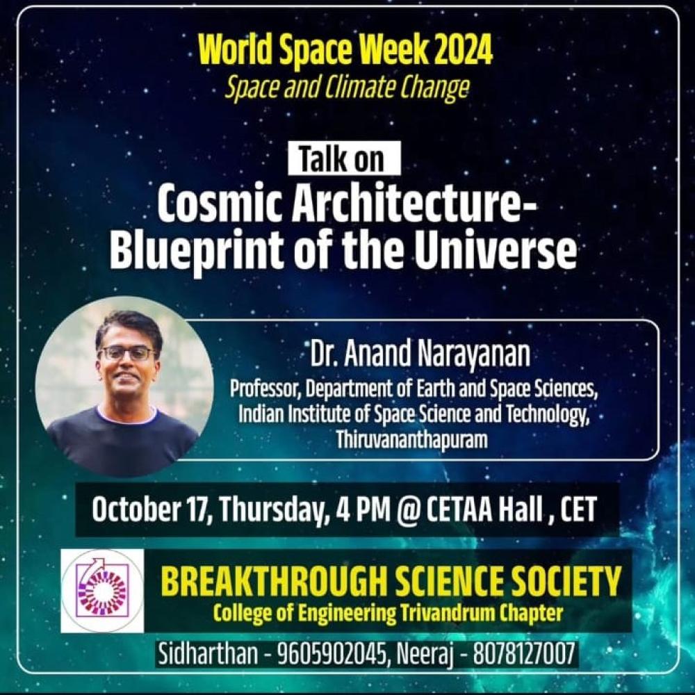 COSMIC ARCHITECTURE - BLUEPRINT OF THE UNIVERSE by Dr.Anand Narayanan, a renowned Astrophysicist and Professor, IIST, Thiruvananthapuram on 17-October-2024, Thursday, 4 PM at CETAA Hall, CET.