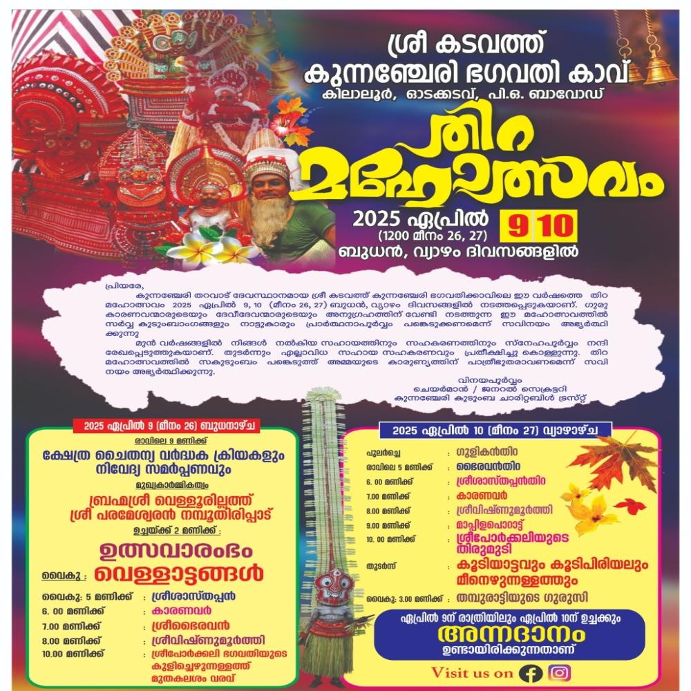 Kilaloor Kunnancheri Bhagavthi Kavu Taluk : Kannur Panchayath : Peralasseri Contact No: 9947970044 Performing Theyyams Gulikan (10 Apr 2025 - 03:00 AM), Vishnumoorthy (10 Apr 2025 - 07:00 AM), Mappila Theyyam (10 Apr 2025 - 08:30 AM), Karanavar (10 Apr 2025 - 06:00 AM), Bairavamoorthi (10 Apr 2025 - 04:00 AM), Valiya Thamburan (10 Apr 2025 - 10:00 AM), Kuttichathan (10 Apr 2025 - 05:00 AM), Kannur