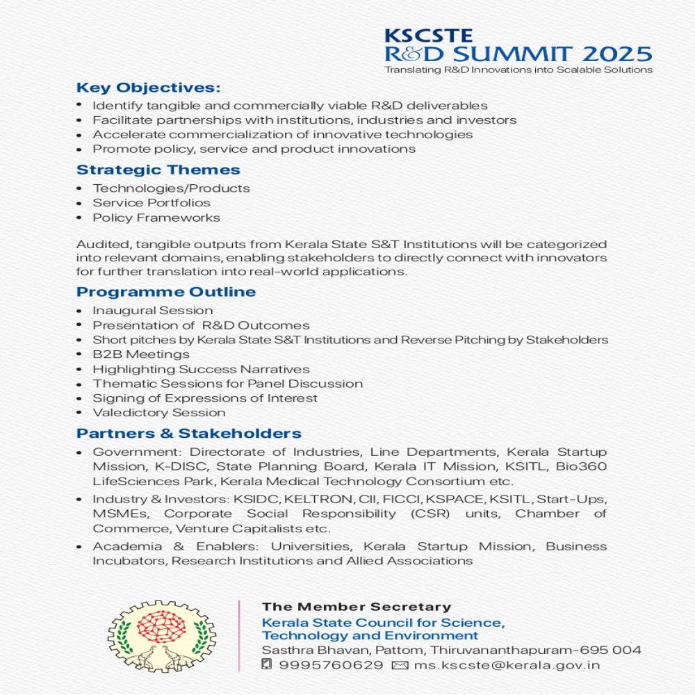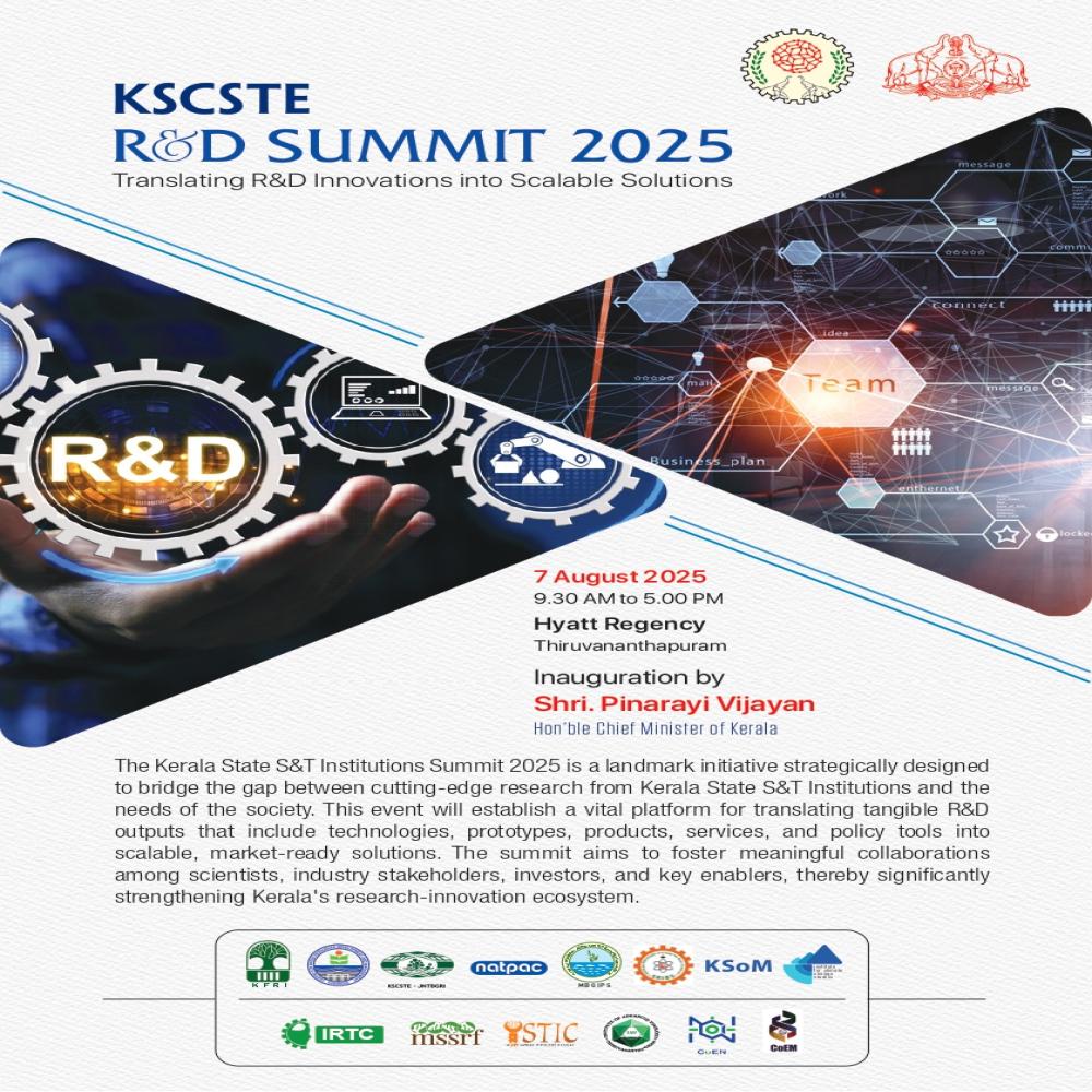 The Kerala State S&T Institutions Summit 2025 is a landmark initiative strategically designed to bridge the gap between cutting-edge research from Kerala State S&T Institutions and the needs of the society. This event will establish a vital platform for translating tangible R&D outputs that include technologies, prototypes, products, services, and policy tools into scalable, market-ready solutions. The summit aims to foster meaningful collaborations among scientists, industry stakeholders, investors, and key enablers, thereby significantly strengthening Kerala’s research-innovation ecosystem.