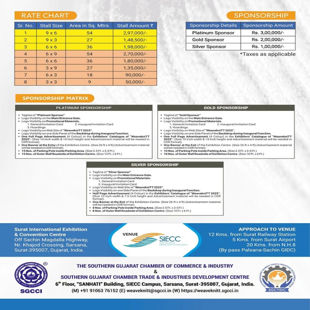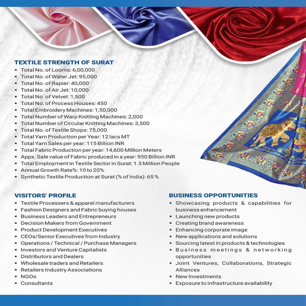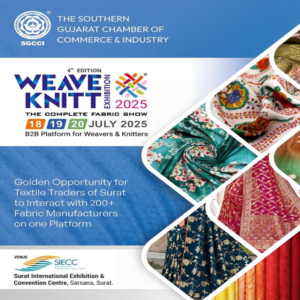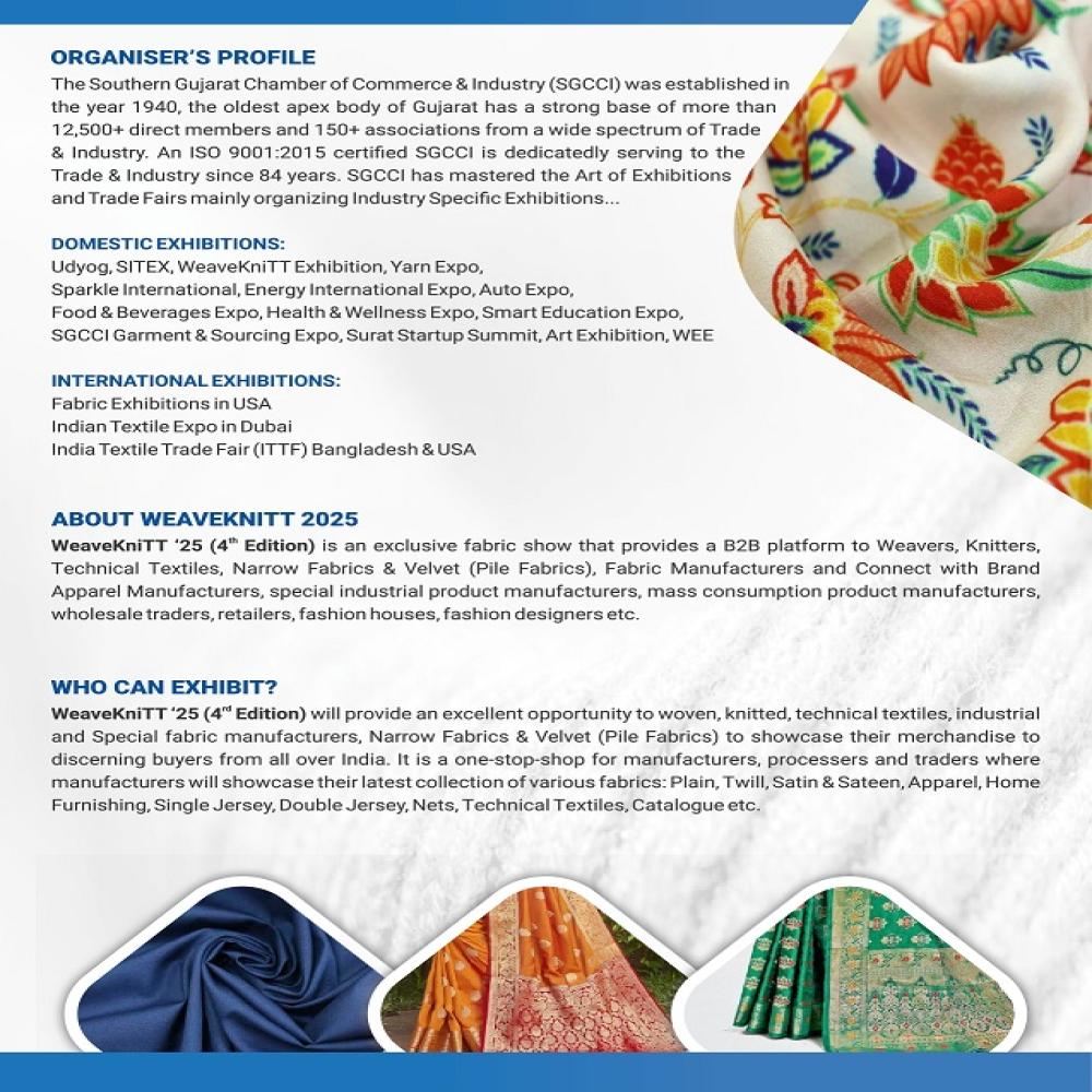 An exclusive fabric show “WeaveKniTT 2025” (4th Edition) provides a B2B platform to Weavers, Knitters, Technical Textiles, Narrow Fabrics & Velvet (Pile Fabrics), Fabric Manufacturers and Connect with Brand Apparel Manufacturers, special industrial product manufacturers, mass consumption product manufacturers, wholesale traders, retailers, fashion houses, fashion designers etc.